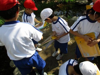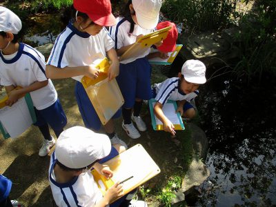 1時間目に生活科「春見つけ」の学習でビオトープの「春」を見つけに行きました。