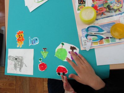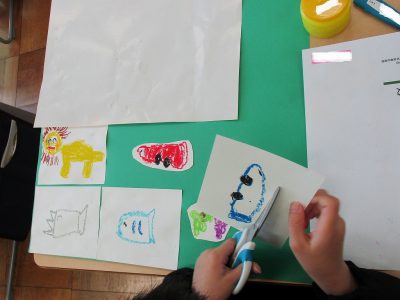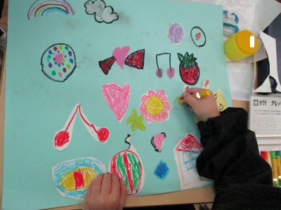 今日は、前回描いた絵を好きな色の色画用紙に貼っていきます。