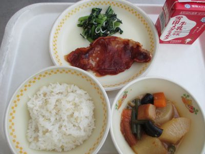 今日の献立は「豚肉のケチャップ焼き・小松菜のソテー・大根の煮物」でした。