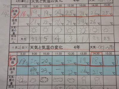実際に温度計を使って、1時間ごとに気温を調べに行きました。