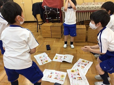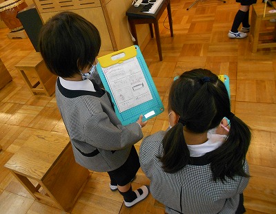 昨日学習を始めた「♪小さなはたけ」の活動の続きです。「小さな・中くらいの・大きな」 “はたけを耕して” “種をまいて” “ずんずん芽が伸びて” “花が咲きました” 歌に合わせた、強さや速さを変化させることがねらいの教材です。