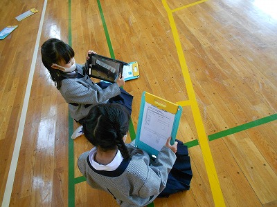 終了時刻までに校内を回り終えたペアは、体育館で「ここは、どこでしょう?」クイズを行いました。事前学習で2年生が撮った写真を見てもらい、どの教室にあるものなのかを考えるクイズです。