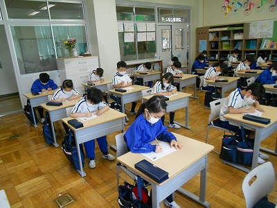 れんげデビュー集会のめあてを確認した後、漢字テストをしました。