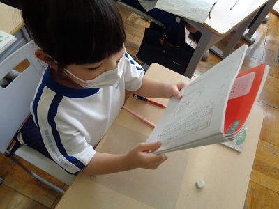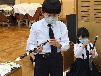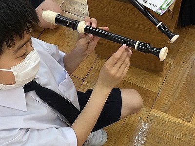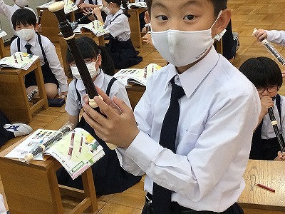 いよいよリコーダーを渡す日が来ました。「春の小川♪」の階名唱テストを行っている間に、“マイ・リコーダー”を手にして、形や穴の数、穴の大きさなど、気づいたことを教科書に書き込む活動を進めました。