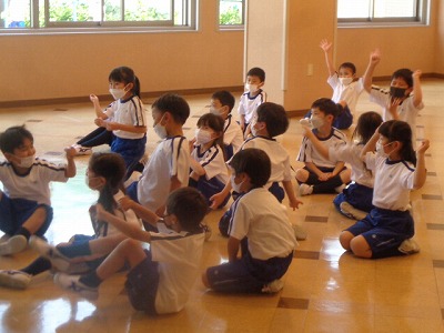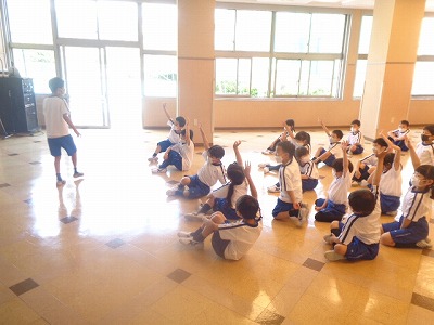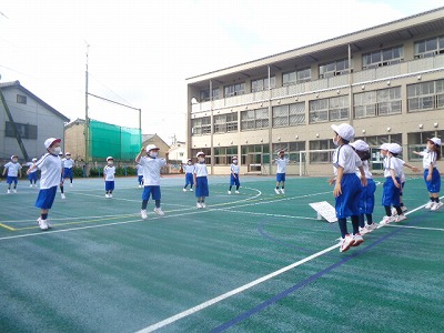 準備体操の様子です。日直さんが準備体操ボードを見ながら、体操メニューを伝えてくれています。随分メニューが読めるようになりました。