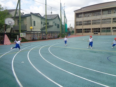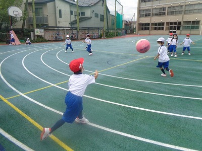 その後、ボールで色々な運動をして、最後は2グループに分かれて中当てをしました。