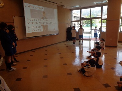 1年生に学校の先生を知ってもらおうという企画です。多目的室「和の部屋」で「先生クイズ Who is this?」のはじまり、はじまり~!