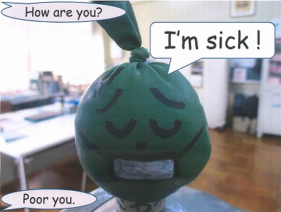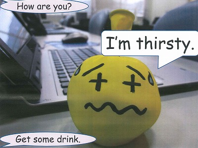 "I'm thirsty." 水分をとるのを忘れていたバルーンさん。「のどが かわいた」の、"I am thirsty." でした。
