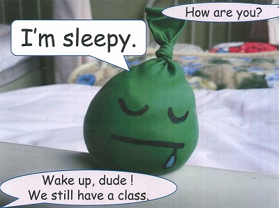 "I'm sleepy." 保健室のベッドの上にいるバルーン君。ねむいようです。