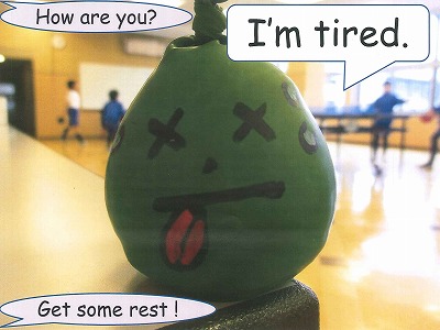"I'm tired." 卓球教室のメンバーと一緒にいるバルーン君。試合後に やや疲れ気味で "I am tired."