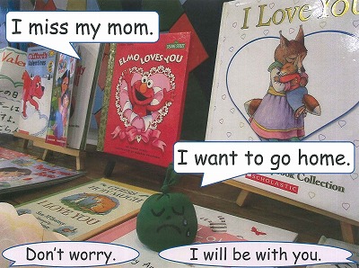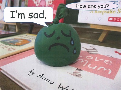 英語絵本を見て、ママを思い出したのでしょう。悲しい時に使うフレーズ、“I'm sad.”です。