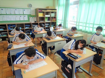 今日の算数は「角とその大きさ」のまとめ学習に入りました。ですが、まだまだ練習が必要です!プリントの練習をくり返し、最後に「確認プリント」に取り組みました。三角定規の角度の大きさや、一回転、半回転の角の大きさを思い出しながら、分度器をうまく使って取り組みます。