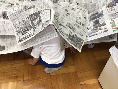 今日の図工は、みんなで協力して新聞紙で造形室を包んでいきました。