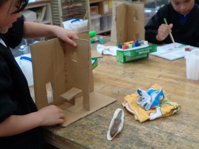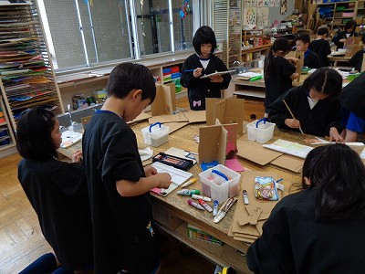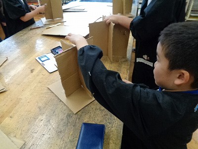 段ボールを使って「4つの世界」の作品づくりです。