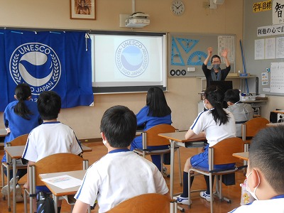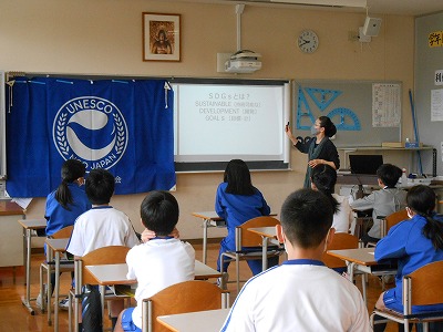 2時間目は、元教頭の江木先生(現 京都ユネスコ協会常任理事)にお越し頂き、「SDGs」についての授業を聞きました。