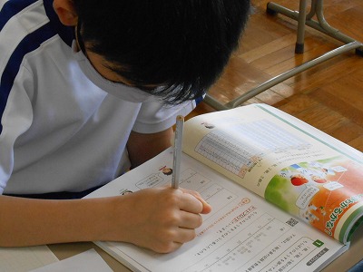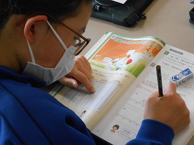 まずは、クラスの平均値を求めて比べる方法です。すべての数値を足し算するところから始めるのですが、なかなか数が合わずに苦戦していました。簡単な足し算も、数が増えると混乱してしまいます。ていねいに、集中して取り組みました。