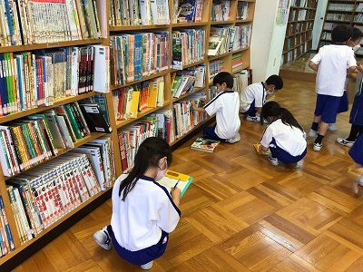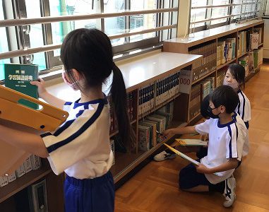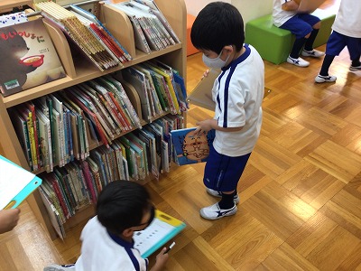 図書室へ行きました。今日は、本の場所を知るために、色々な本・図鑑・辞書を探しました。