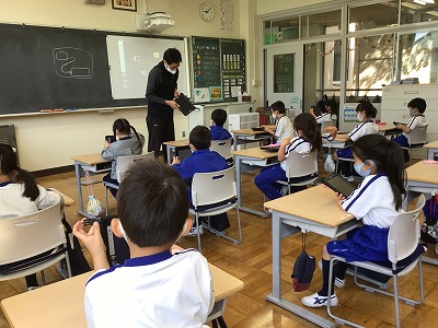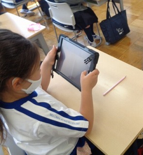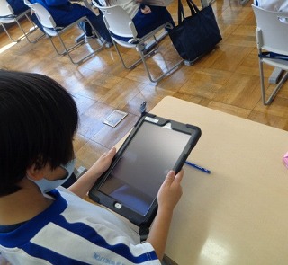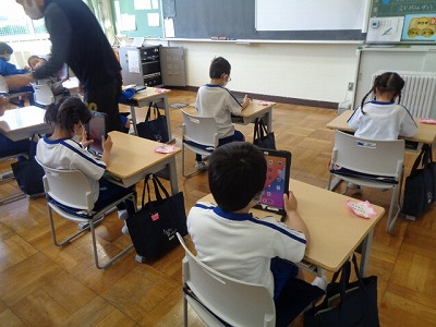 1校時の「せいかつか」の時間。今日は、1年生にとって初めてのタブレットの学習をしました。