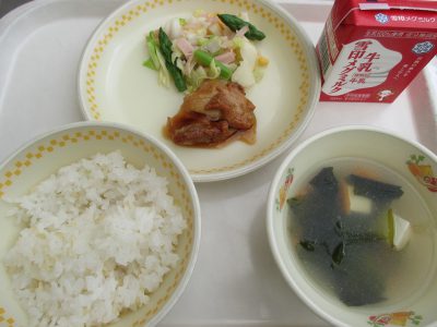 今日の献立は「鶏の照り焼き、アスパラのソテー、豆腐のスープ」でした。