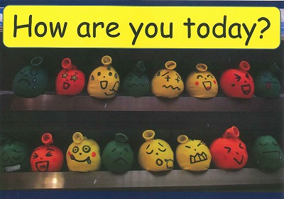 まさに、十人十色! いつも、おたがいに、“How are you ?” とたずね合ったり、こたえ合ったりしましょう。ちょっと、はずかしいなと思っている人は、先生の動画を見てください。シャイな先生が、勇気を出して演じました。少しは参考になるでしょう。