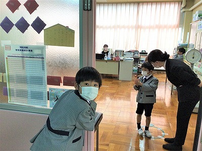 2年生は、2時間目に視力検査が行われました。名簿順に5人ずつ保健室に行って検査を受けます。一人戻ると次の人が並ぶというように、うまく回転しながら進めて行きました。