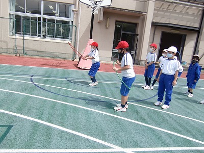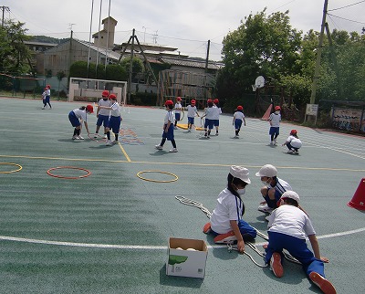 縄跳びならぬ「輪跳び」をしています。