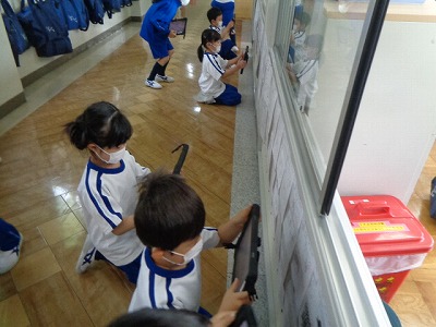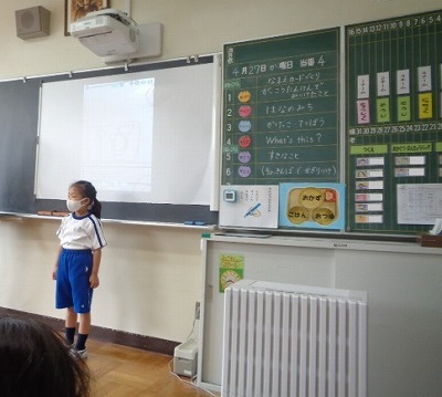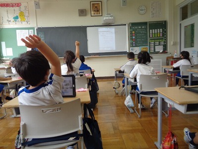 今日は、先週学習した「がっこうたんけん」で自分が見つけたものを発表しました。自分がかいたプリントの絵をタブレットで写真に撮り、タブレット上の提出箱に入れ、みんなの写真を共有して見ることができました。