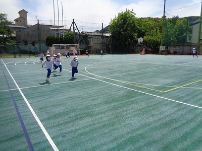 気持ちのよい青空のもと、運動場2周を走ってスタートです。