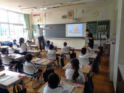 子ども達が、かいてほしい絵をリクエストしました! Star, Cat, Lion, Elephant, Girl... どんなリクエストにも応えるポール先生。"Draw a picture of..."の英語表現を使って、なんとか発表をがんばりました。なかなか覚えられないフレーズです。1年生のみんな、またやろうね!