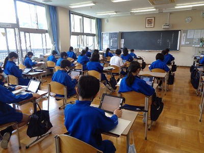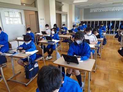 社会は、日本国憲法3原則の一つ「基本的人権の尊重」の学習です。国民の権利と義務を確認した後、教科書に出ていた用語「ユニバーサル・デザイン」の製品などを、タブレットを使って調べました。