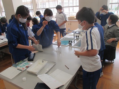 教科書の通り、水上置換で集気瓶にボンベを使って、気体を満たします。