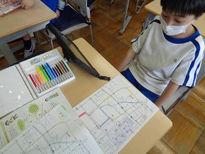 校区探検のまとめとして、学校周辺のマップ作りに取り組みました。