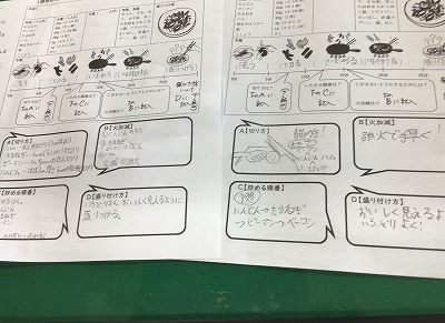 野菜の切り方や、炒める手順などについて、言葉やさし絵で書き留め、“エア調理”に向かいます。