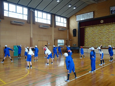 準備体操が終わると、これも今年からチャレンジしている腕立て・腹筋・背筋を5回ずつです。最近は、少しフォームが安定してきました。この後は2人組であまりスピードが出ないようにして、ミニサーキットを楽しみました。みんなノリノリで体力づくりを楽しむことができました。