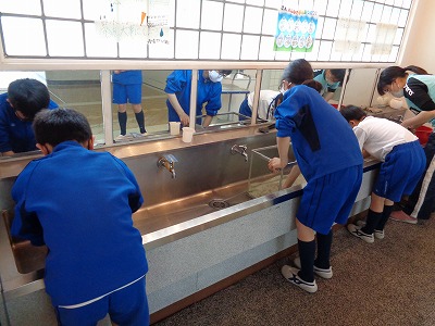 メダカの水槽掃除をしています。大変な作業ですが、今では仕事を覚えて、手際よく進めています。