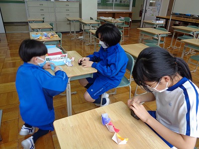 先日、1年生のクイズ集会では大活躍でした。今日は、延期になった動物園ウキウキウォーキングのプレゼント作りをしました。