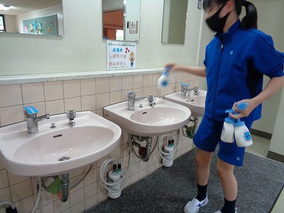 石鹸の容器を洗ったり、シールを張り替えたりしました。石鹸液を補充して、各コーナーに置いているところです。