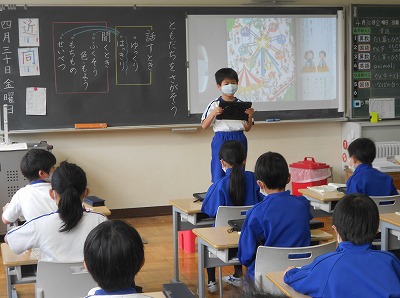一昨日の「ともだちをさがそう」という学習の続きです。今日は、前の時間に書いたメモをもとに、一人ずつ前に出て、みんなに迷子のお知らせをしました。