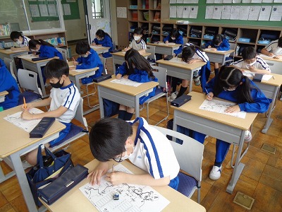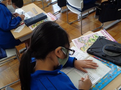 今日は、いよいよ漢字辞典を使う学習が始まりました。漢字辞典は国語辞典と違い、いろいろな調べ方がある事が分かりました。総画引き、音訓引き、部首引き…など、難しい漢字をどのようにして引くのか、辞書を使って試行錯誤した1時間でした。