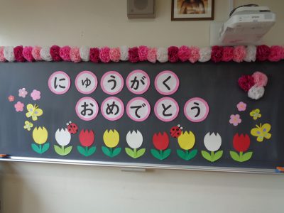 掲示板には「文教小へ」と書いてあります。その横にはお花があります。よく見ると……「ようこそ」の文字になっていました。実は昨日、6年生が作ってくれていたのでした!