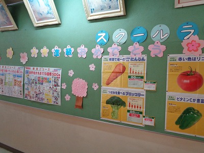 職員室横の掲示も桜色です。左端の1年生個人写真の周りも、お花畑のように素敵に囲まれています!
