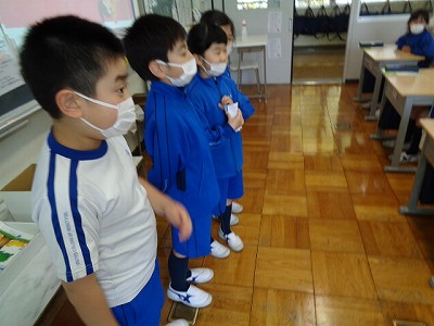子どもたちから「帰りの会も英語を交えて取り組みたい」との声を受け、練習をスタートさせました。二学期の後半には流れを理解し、スムーズに進行できるまで頑張ってもらいたいと考えています。