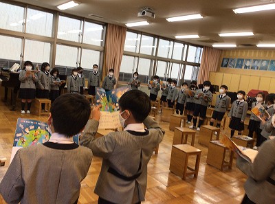 まず、「♪小さな世界」の歌唱から始まりです。1番はお馴染みなのですが、2番3番と歌うことは初めての3年生です。