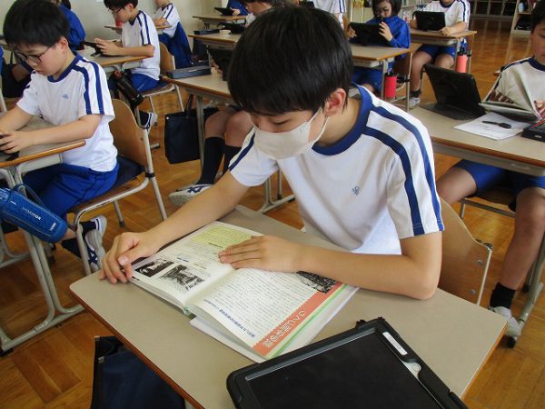 今日は、タブレットと図書室の本を使い、テーマに沿った調べ学習に励みました。今日の調べ学習で、新たな気付きが多くあったことと思います。