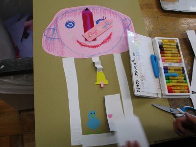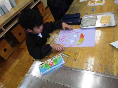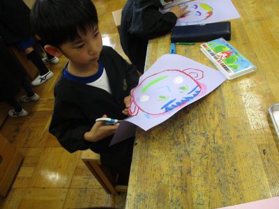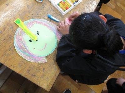 まずは、色画用紙にクレパスで自分の顔を描きました。