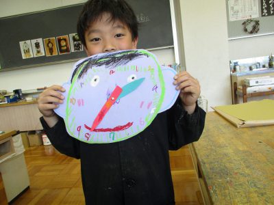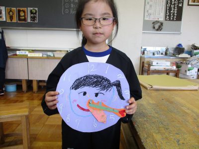 今日の図工は、自分の顔の時計を作りました。