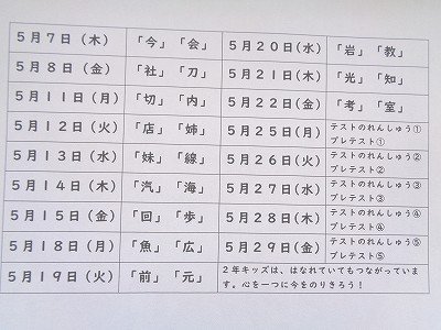 新出漢字の学習を「同」までとしていました。しかし、休校期間の延長を鑑み、5月6日以降も2文字ずつ進めていきたいと存じます。