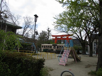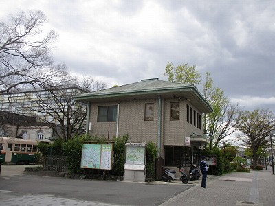 交番の南と西側に公園があります。昔、京都市内を走っていた「市電」もあります。
