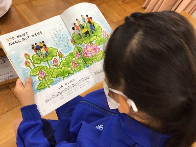 「♪ひらいたひらいた」や「♪おちゃらか」のあそびうたを楽しむ時間です。