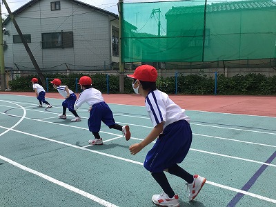 かけっこの前に「ふえ鬼」をしました。鬼がどんどん増えていき、最後は全員が鬼に!運動場いっぱい使って、たくさん走りました。